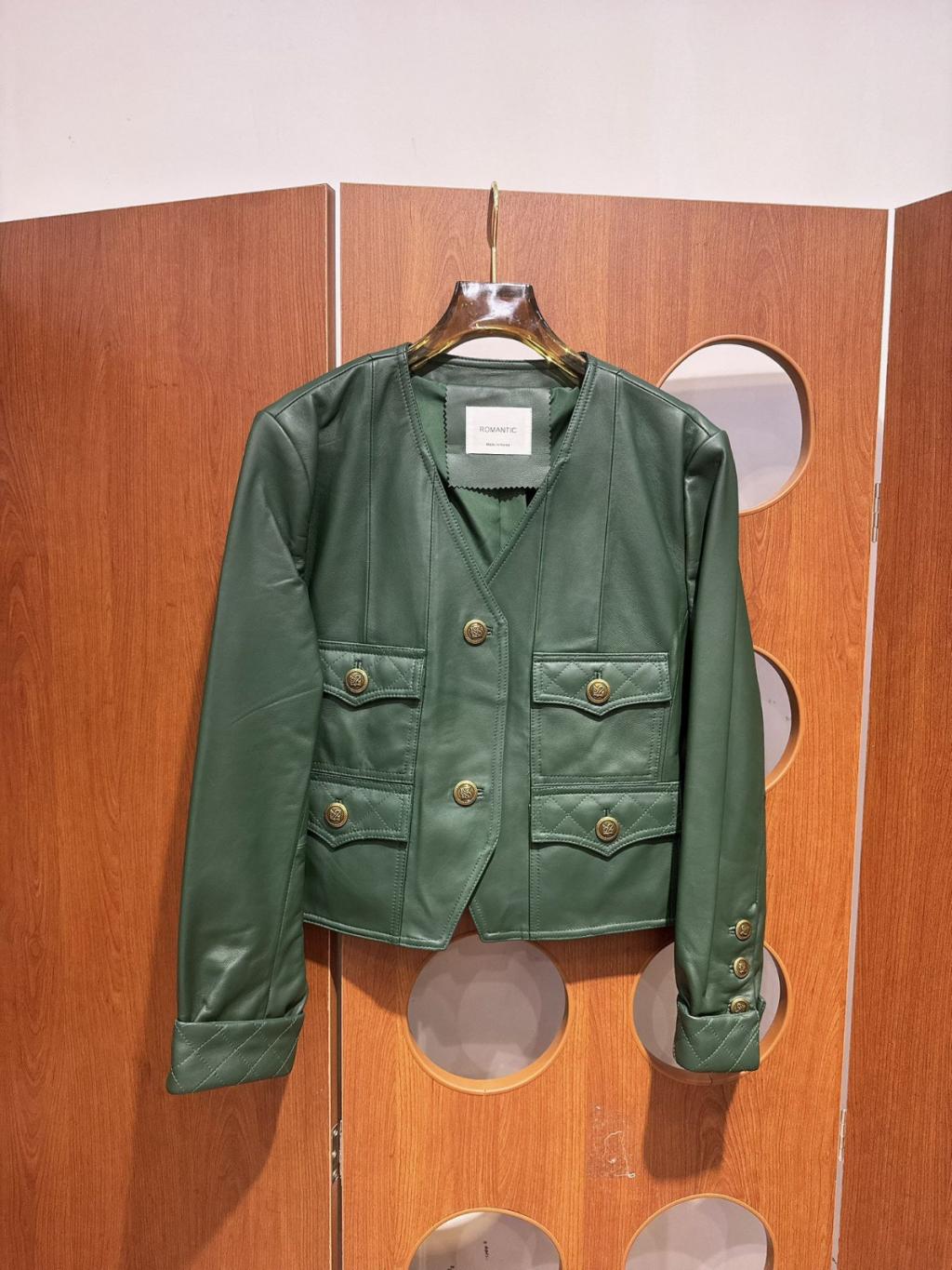 主頁 C3祖母綠羊仔皮拼菱格 V領真皮外套